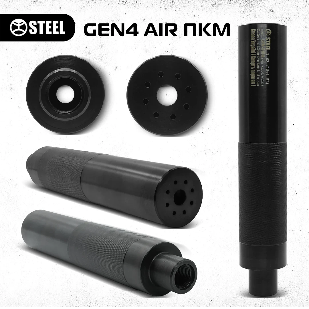 GEN 4 AIR 7.62 різьблення 18х1.5 Lh (ПКМ, ПК) GEN 4 AIR 7.62 18х1.5 Lh (ПКМ, ПК) Товар з категорії “Товари військового часу” Ефективність: 32-34 дБ Вага: 590 гр Габарити: 210х42 мм Конструкційна сталь Покриття: вороніння Надміцний, тримає всі навантаження, що і сам прилад