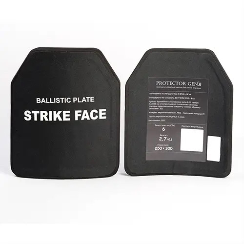 Балалістична керамічна пластина Балістичні пластини виготовлені за стандартами НАТО. Розмір: 250х300 мм Товщина: 24 мм Вага (одна плита): 2,8 кг Виробник: Study Armor Мають протокол випробувань. Виготовлені: керамічні елементи АІО2 + балістичний матеріал PE Захист бронеплит від бронебойно-займистуваної кулі Б-32 калібру 7,62х54 мм із гостростандартною головковою частиною, сталевим термозаплетеним осердям у сталевій оболонці (гвинтівка СВД) Максимальний захист. Легка й ергономічна. 3D-зігнута форма тіла. Використовується для грудей ти спини. Незалежні тести в лабораторії.
