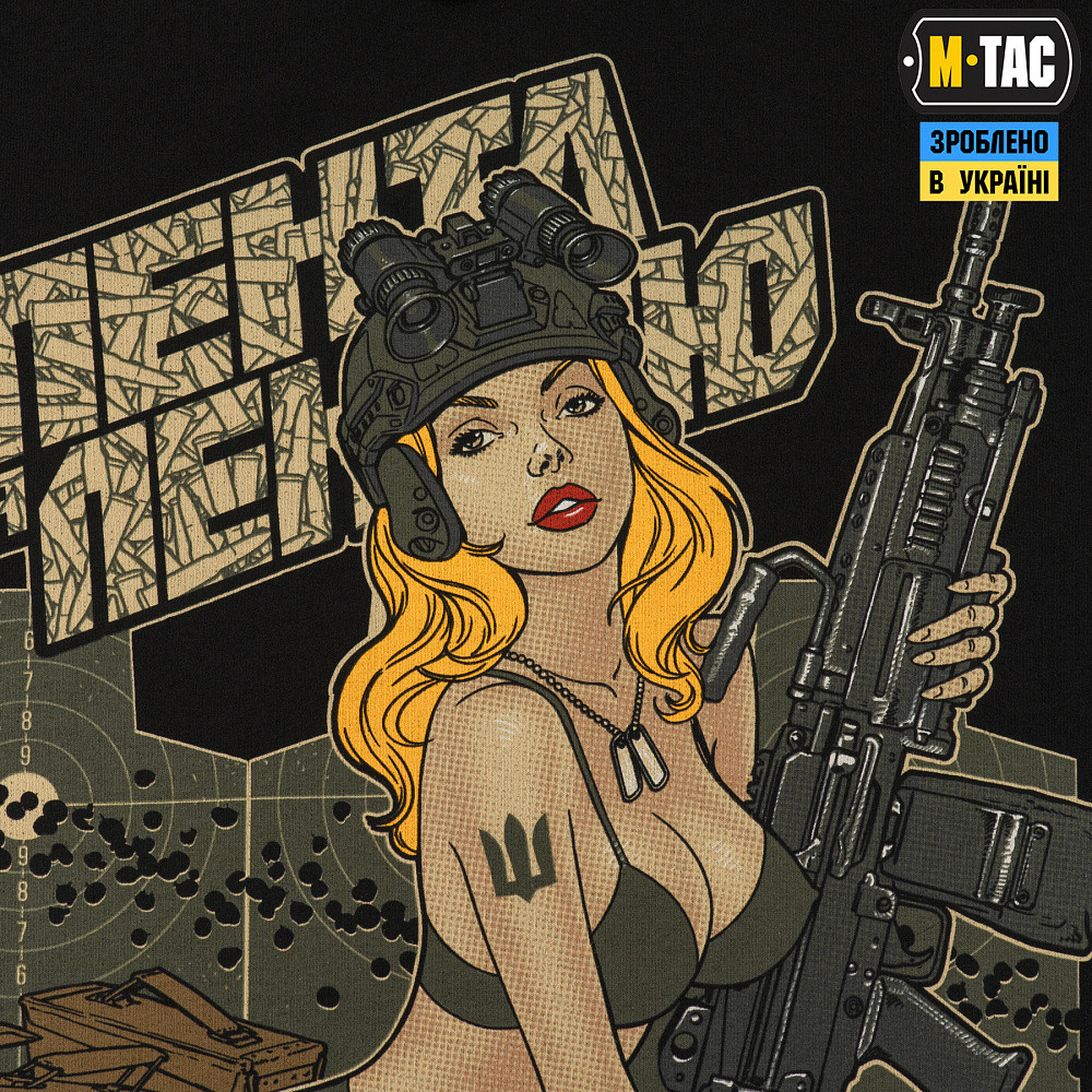 M-Tac кофта Hoodie Лента за лентою Black З середини ХХ-го століття Pin-Up набув неабиякої популярності в американській культурі, а вродливі Pin-Up дівчата відображали красу та естетику того часу. Це були привабливі напівоголені жіночі фігури з ексцентричним вбранням, ефектним макіяжем і зачіскою, що підкреслювала їх жіночність. Pin-Up стиль став особливо популярним під час Другої світової війни, коли американці з красунями на бортах воювали за демократію, відстоюючи цінності свободи й незалежності. Бренд М-Тас, розширюючи лінійку виробів Tactical Girl, випустив нову тематичну КОФТУ HOODIE ЛЕНТА ЗА ЛЕНТОЮ. На принті зображена приваблива дівчина в стилі Pin-Up, яка є уособленням краси та сили характеру. Зверху принта розміщений напис: “Лента за лентою” – слова з відомої повстанської пісні, яка стала символом незламного українського визвольного руху. Так само як і в пісні, дівчина тримаючи у своїх руках кулемет М249, готова зайняти місце пораненого воїна, аби завдати нищівного удару противнику. Тож, після її плідної праці, окупантів на українській землі буде менше, а добрива – більше. Вільний крій M-TAC КОФТИ HOODIE ЛЕНТА ЗА ЛЕНТОЮ не обмежує рухи під час фізичних навантажень. Зручний капюшон регулюється за об’ємом та відмінно захищає від вітру і негоди. Манжети рукавів та низ виробу виконані з трикотажної резинки, завдяки чому вони зберігають форму та запобігають потраплянню холодного повітря всередину виробу. Матеріал: бавовна, еластан; Друк: MagnaColours® (Premium inks resist fading).