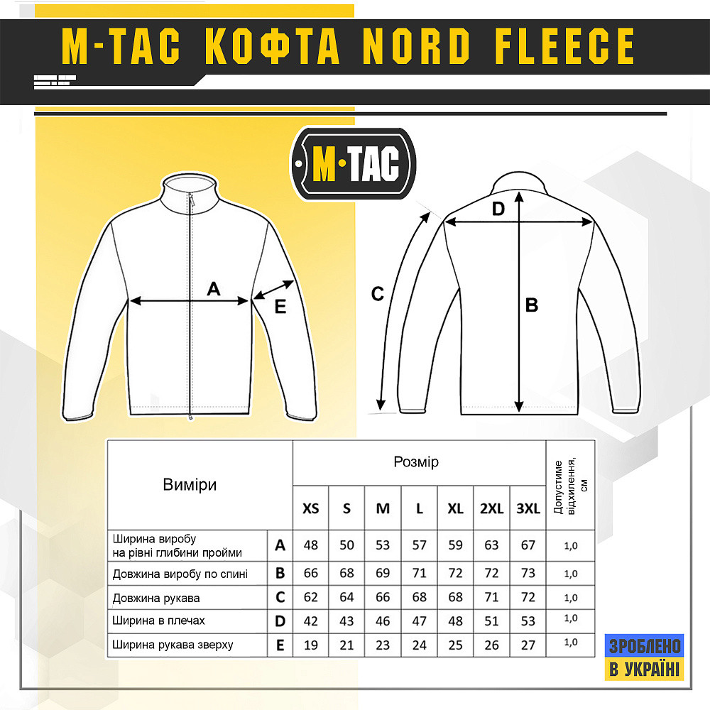 M-TAC КОФТА NORD FLEECE POLARTEC COYOTE Кофта M-Tac Nord Fleece Black виготовлена з флісу преміального класу від всесвітньо відомого американського бренду Polartec®. Це перша з лінійки флісок, народжена у співпраці М-Тас (TM) і Polartec®, призначена як для повсякденного носіння, так і для занять спортом. Фліс Polartec® 200 Series крім відмінних теплових властивостей, володіє прекрасним паропропуском і може використовуватися як нижній шар із мембранними куртками і софтшелами. Фурнітура в M-Tac Nord Fleece від YKK (Японія). Polartec® – це назва цілої серії сучасних матеріалів. Всі вони створені для того, щоб вам було тепло, сухо і комфортно незалежно від погоди. За здатністю зберігати тепло людського тіла Polartec не поступається вовні та може бути таким же м’яким і ніжним, як бавовна, але в той же час прекрасно замінює собою одяг із природних матеріалів, який не завжди підходить для активного відпочинку і спорту. Одяг із нього красивий і функціональний, не мнеться, швидко сохне і легко переться. Дуже зручний у повсякденному використанні. Вироби з Polartec підходять не тільки спортсменам, а й усім, хто віддає перевагу спортивному стилю в одязі. Polartec 200 – м’який і майже невагомий, володіє чудовими теплоізоляційними властивостями. На відміну від натуральних тканин, він не накопичує, а відводить надлишкову вологу від тіла, забезпечуючи комфорт. За тепловими властивостями в розрахунку на 1 грам матеріалу Polartec 200 вдвічі перевершує овечу вовну і більш ніж втричі – бавовну. Вироби з Polartec® 200 можуть носитися як окремо, так і в якості внутрішнього шару під вітрозахисний одяг. Розміри в наявності: XS S M L XL 2XL 3XL