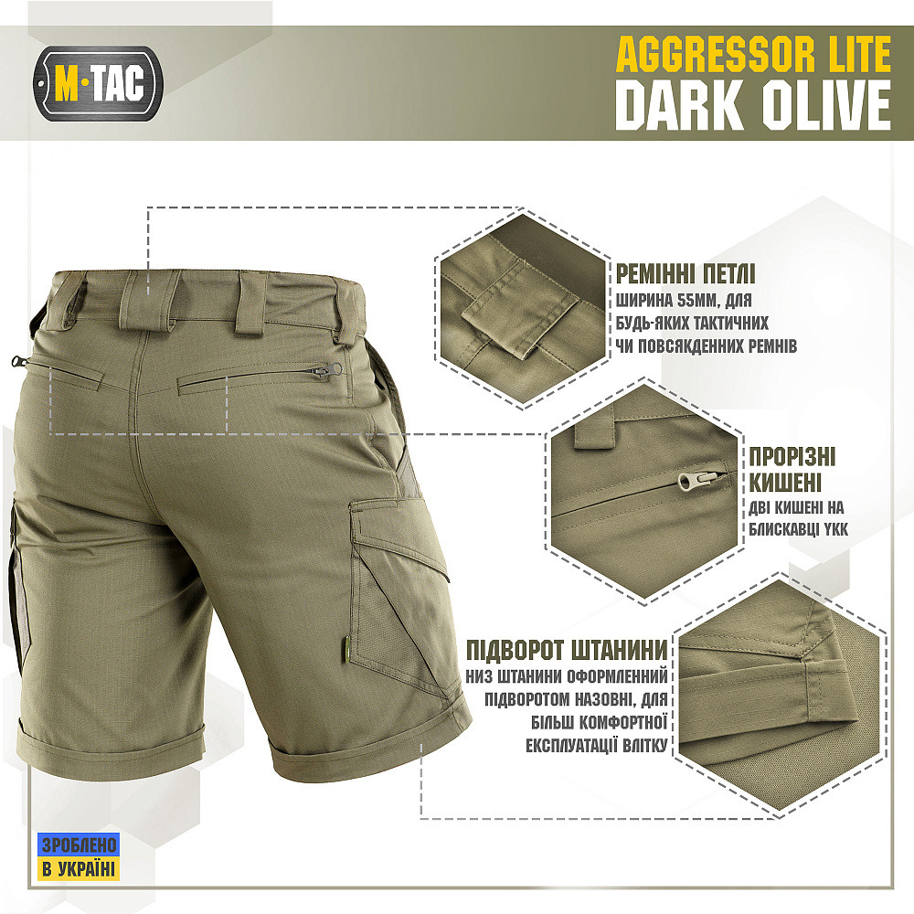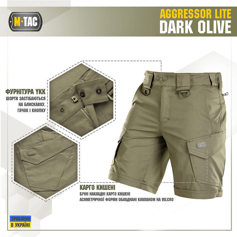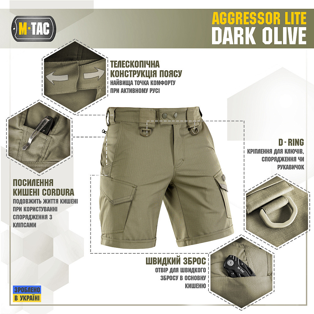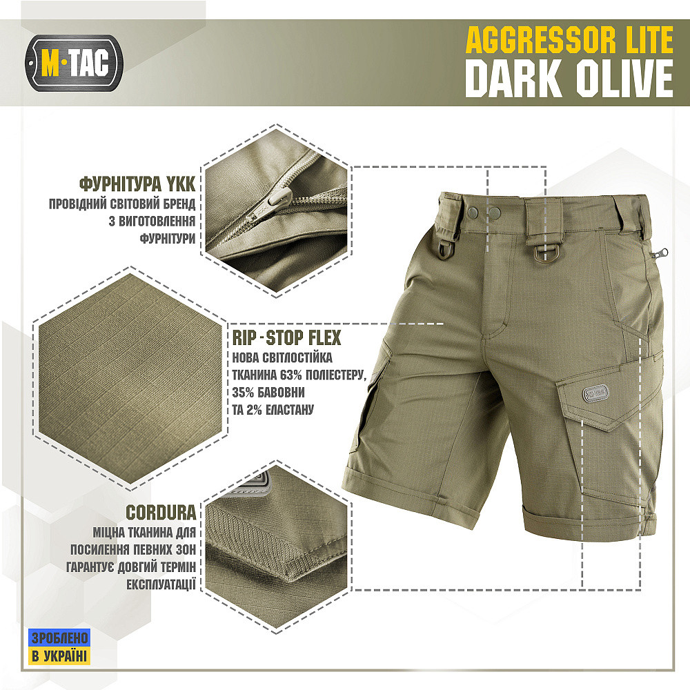 M-Tac шорти Aggressor short засновані на дизайні штанів Aggressor першої генерації, але з деякими доповненнями. Це вкорочена модель шорт «карго»: довжиною до колін, з простроченим відворотом. Такі шорти будуть доречні і в місті і на природі, особливо в умовах спекотної погоди. Ви зможете носити їх на тренування, на стрільбище, на роботу, а також під час подорожі або прогулянки. Шорти не обмежують рухи, і при цьому виглядають як повсякденний одяг в стилі «кежуал», що не впадає в око. Саме непомітний, але функціональний дизайн дозволяє використовувати такі шорти як елемент тактичного одягу. Комфорт рухів забезпечується не тільки завдяки еластичному матеріалу рипстоп полікоттон Flex, але і «тунельній» конструкції пояса, яка забезпечує ідеальну посадку по талії і не заважає нахилятися. Пояс закривається на блискавку, гачок і кнопку, а регулюється за об’ємом за допомогою внутрішніх еластичних вставок. Відразу під фронтальними шлейками для ременя нашиті D-кільця YKK для кріплення предметів за допомогою карабіна або петлі. Шорти розраховані на носіння з ременем шириною до 5.5 см. Шість зручних кишень дозволять вам оптимально розподілити в них ті речі, які ви звикли носити з собою щодня. Широкі бічні брючні кишені посилені вставками в нижній частині: тут є місце для кріплення кліпси складного ножа, тактичної ручки або міні-ліхтаря. Бічні карго-кишені обладнані асиметричним клапаном на велкро, який спрощує доступ руки в кишеню, але не дозволяє вмісту висипатися, навіть якщо ви активно рухаєтеся. Розширювальна складка на карго-кишені – це одночасно і декоративний, і функціональний елемент. Вона дозволяє за необхідності збільшувати внутрішній об’єм кишені для перенесення габаритних речей. Пара задніх кишень – прорізні в рамку, і закриваються на «блискавки». Така конструкція зводить до мінімуму ризик втрати вмісту кишень, навіть якщо ви повисли догори ногами, повзете на спині, або перекочуютесь, що часто буває при виконанні тактичних вправ. Шорти пошиті з легкої, однотонної тканини рипстоп, з водо- і брудозахисним просоченням Teflon. Склад: бавовни, поліестер і спандекс. Тканина з вмістом поліестеру і бавовни приємна до тіла. А додавання спандексу надає матеріалу еластичність, що допомагає шортам ідеально сісти по фігурі і не перешкоджати активним рухам. Матеріал: бавовна поліестер спандекс Фурнітура: YKK Teflon: Володіє високими показниками морозо- і теплостійкості. Teflon залишається еластичним і гнучким при значних температурах від -70 до + 270 ° C, будучи найкращим ізоляційним матеріалом сучасності. Одночасно, Тефлон має чудову адгезію і низький поверхневий натяг, він не змочується ні жирами, ні водою, ні іншими речовинами і можливими розчинниками. Тефлон абсолютно не відчутний і візуально непомітний людині, але його властивості мають реальну дію. Бруд, пил або вода завжди залишаються на поверхні одягу, збираючись в краплі і легко очищаються простою щіткою. Кишені: -2 бічні брючні кишені (з посиленням в нижній частині, що призначене для кріплення ножа) -2 задні кишені -2 карго-кишені на стегнах з асиметричним клапаном на липучці Прати рекомендується в делікатному режимі, при температурі не більше 30 градусів