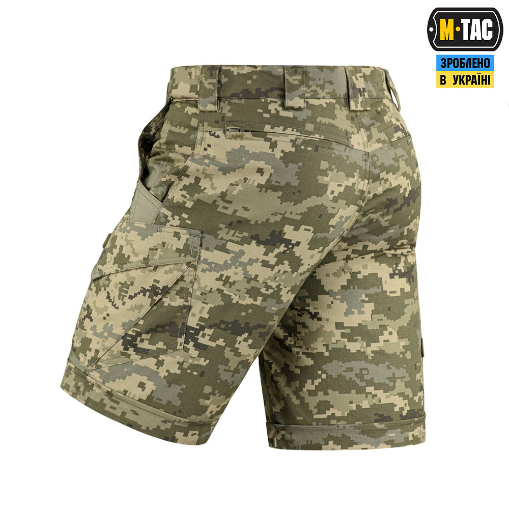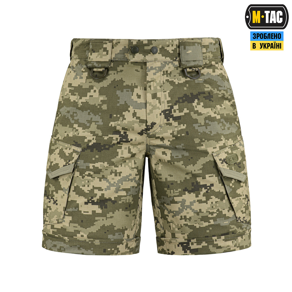 M-Tac шорти Aggressor short засновані на дизайні штанів Aggressor першої генерації, але з деякими доповненнями. Це вкорочена модель шорт «карго»: довжиною до колін, з простроченим відворотом. Такі шорти будуть доречні і в місті і на природі, особливо в умовах спекотної погоди. Ви зможете носити їх на тренування, на стрільбище, на роботу, а також під час подорожі або прогулянки. Шорти не обмежують рухи, і при цьому виглядають як повсякденний одяг в стилі «кежуал», що не впадає в око. Саме непомітний, але функціональний дизайн дозволяє використовувати такі шорти як елемент тактичного одягу. Комфорт рухів забезпечується не тільки завдяки еластичному матеріалу рипстоп полікоттон Flex, але і «тунельній» конструкції пояса, яка забезпечує ідеальну посадку по талії і не заважає нахилятися. Пояс закривається на блискавку, гачок і кнопку, а регулюється за об’ємом за допомогою внутрішніх еластичних вставок. Відразу під фронтальними шлейками для ременя нашиті D-кільця YKK для кріплення предметів за допомогою карабіна або петлі. Шорти розраховані на носіння з ременем шириною до 5.5 см. Шість зручних кишень дозволять вам оптимально розподілити в них ті речі, які ви звикли носити з собою щодня. Широкі бічні брючні кишені посилені вставками в нижній частині: тут є місце для кріплення кліпси складного ножа, тактичної ручки або міні-ліхтаря. Бічні карго-кишені обладнані асиметричним клапаном на велкро, який спрощує доступ руки в кишеню, але не дозволяє вмісту висипатися, навіть якщо ви активно рухаєтеся. Розширювальна складка на карго-кишені – це одночасно і декоративний, і функціональний елемент. Вона дозволяє за необхідності збільшувати внутрішній об’єм кишені для перенесення габаритних речей. Пара задніх кишень – прорізні в рамку, і закриваються на «блискавки». Така конструкція зводить до мінімуму ризик втрати вмісту кишень, навіть якщо ви повисли догори ногами, повзете на спині, або перекочуютесь, що часто буває при виконанні тактичних вправ. Шорти пошиті з легкої, однотонної тканини рипстоп, з водо- і брудозахисним просоченням Teflon. Склад: бавовни, поліестер і спандекс. Тканина з вмістом поліестеру і бавовни приємна до тіла. А додавання спандексу надає матеріалу еластичність, що допомагає шортам ідеально сісти по фігурі і не перешкоджати активним рухам. Матеріал: бавовна поліестер спандекс Фурнітура: YKK Teflon: Володіє високими показниками морозо- і теплостійкості. Teflon залишається еластичним і гнучким при значних температурах від -70 до + 270 ° C, будучи найкращим ізоляційним матеріалом сучасності. Одночасно, Тефлон має чудову адгезію і низький поверхневий натяг, він не змочується ні жирами, ні водою, ні іншими речовинами і можливими розчинниками. Тефлон абсолютно не відчутний і візуально непомітний людині, але його властивості мають реальну дію. Бруд, пил або вода завжди залишаються на поверхні одягу, збираючись в краплі і легко очищаються простою щіткою. Кишені: -2 бічні брючні кишені (з посиленням в нижній частині, що призначене для кріплення ножа) -2 задні кишені -2 карго-кишені на стегнах з асиметричним клапаном на липучці Прати рекомендується в делікатному режимі, при температурі не більше 30 градусів