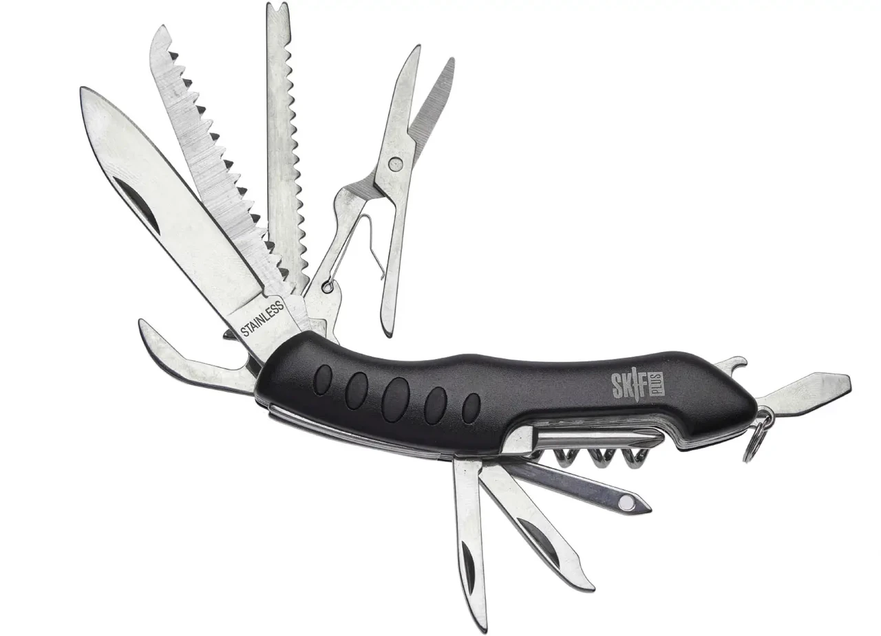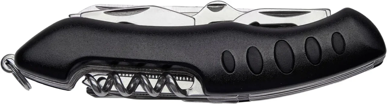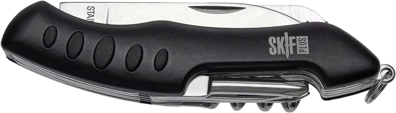 Ніж багатофункціональний Skif Plus Fluent Black Мультитул SKIF Plus Fluent представляє собою невеликий, але вкрай корисний інструмент, котрий буде актуальним практично в будь-якій ситуації. Набір інструментів в цьому невеликому мультитулі варіюється від пилки до викрутки, при тому, що габарити мультитула складають всього 96 мм в довжину при масі 114 грам. Накладки на руків’я виконані з алюмінієвого сплаву з анодуванням і доповнені пластиковими вставками. В набір інструментів входять: – Клинок. – Ножиці. – Консервний ніж. – Відкривачка для пляшок. – Велика плоска викрутка. – Пилка. – Рибочистка. – Інструмент для зняття гачка. – Викрутка Phillips. – Штопор. – Шило. – Інструмент для чищення нігтів. – Пилка для нігтів. – Криголам. – Кільце для ключів.