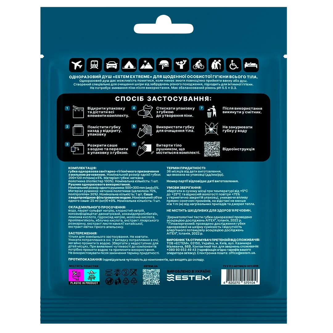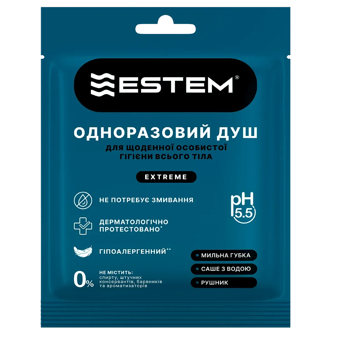 Одноразовий душ Estem Extreme — зручне та ефективне рішення для забезпечення чистоти шкіри в умовах, де доступ до води відсутній або обмежений. Комплект включає мильну губку, рушник і саше з 25 мл води для активації. Завдяки спеціальній формулі одноразова мильна губка забезпечує ретельне очищення навіть від найскладніших забруднень, не потребуючи змивання водою. Основні переваги: Ефективне очищення: Спеціально розроблена формула мильної губки дозволяє швидко та якісно очищати шкіру від бруду, жиру й поту, забезпечуючи відчуття свіжості та чистоти. Не потребує змивання: Після використання достатньо витерти шкіру рушником — додатково використовувати воду не потрібно. Безпечна формула: Мильна губка не містить барвників, ароматизаторів, штучних консервантів та спирту, що робить її безпечною для всіх типів шкіри, навіть для чутливої. Дбайливий догляд за шкірою: Гіпоалергенна мильна формула з pH 5.5 підходить для щоденного використання та дерматологічно протестована. Підходить для інтимної гігієни: Формула розроблена для дбайливого догляду за чутливими зонами тіла. Натуральні компоненти: До складу просочення входять екстракти листя зеленого чаю, розмарину та квітки гіркого апельсину, які зволожують та освіжають шкіру. Компактність і зручність: Комплект легко поміщається в сумку чи рюкзак, забезпечуючи гігієну в дорозі чи будь-яких умовах. Одноразовий сухий душ Estem Extreme — це простий спосіб підтримувати особисту гігієну де завгодно, забезпечуючи чистоту та комфорт без зайвих зусиль.