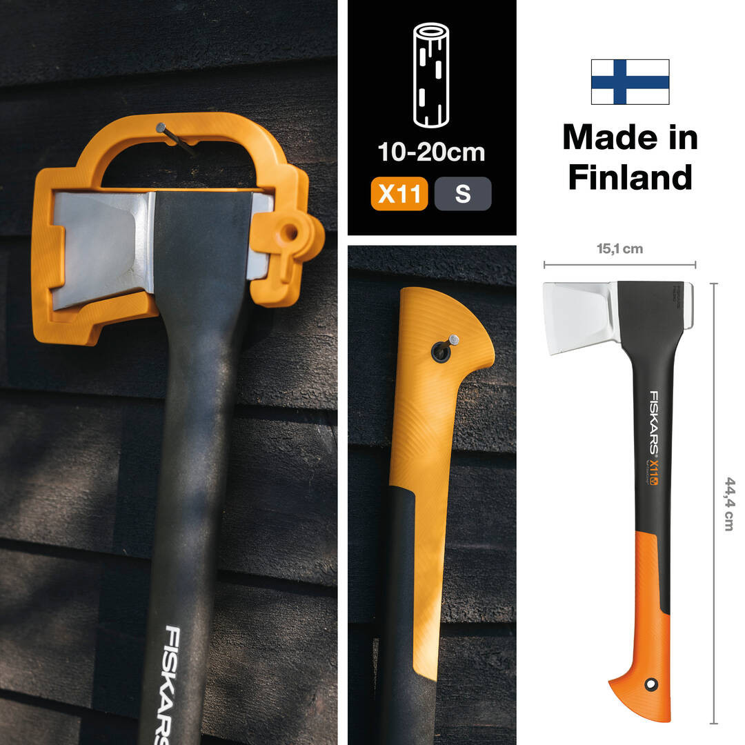 Топор-колун Fiskars X11 Призначений для колки полін діаметром менше 20 см. Завдяки компактним розмірам підходить для роботи однією рукою. Основні характеристики: Матеріал леза: загартована сталь; Матеріал рукоятки: FiberComp; Колір: чорний/помаранчевий; Ширина: 151 мм; Довжина: 444 мм; Висота: 33 мм; Вага: 1100 г; Серія: X-Series; Тип: ручний колун. Особливості: Випукла форма клина забезпечує легке витягування топора з деревини; Отшліфоване лезо з подвійною загартовкою гарантує максимальну міцність; Антифрикційне покриття захищає лезо від корозії; Лезо надійно зафіксоване в рукоятці, що виключає його випадкове зісковзування; Оптимальний баланс між лезом і рукояткою для безпечної та зручної роботи; Легка, міцна і стійка до зносу рукоятка з матеріалу FiberComp™; Покриття SoftGrip™ забезпечує зручне та надійне захоплення; Гачкоподібна форма рукоятки запобігає вислизанню інструмента; Комплектується пластиковим чохлом для зручного зберігання і транспортування; Виготовлено у Фінляндії.