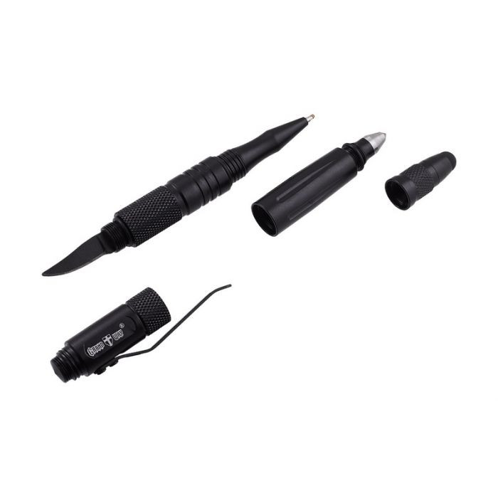 Протилежний кінець рукоятки увінчаний конічним наконечником, який можна використовувати як склобій або навіть склоріз, настільки він жорсткий. На зворотному боці пишучня є лезо, заховане під ковпачком, що також робить цю ручку міні-ножем. Ковпачки нагвинчуються на ручку Grand Way 33087 з двох сторін. Також на ручці є знімна кліпса для носіння на кишені. Ручка Grand Way 33087 – це стильний аксесуар, який можна використовувати не тільки за прямим призначенням, але і прийде вам на допомогу в різних, навіть дуже екстремальних ситуаціях. ВИРОБНИК: GRAND WAY ЗАГАЛЬНА ДОВЖИНА, ММ: 150 МАТЕРІАЛ РУКОЯТКИ: АЛЮМІНІЙ – ДОСТУПНІСТЬ КЛІПУ: ТАК ВАГА, Г: 50 ТИП УПАКОВКИ: КОЛЬОРОВА КАРТОННА КОРОБКА ДОДАТКОВА ІНФОРМАЦІЯ: ФУНКЦІОНАЛ: КУЛЬКОВА РУЧКА, СТИЛУС, НІЖ